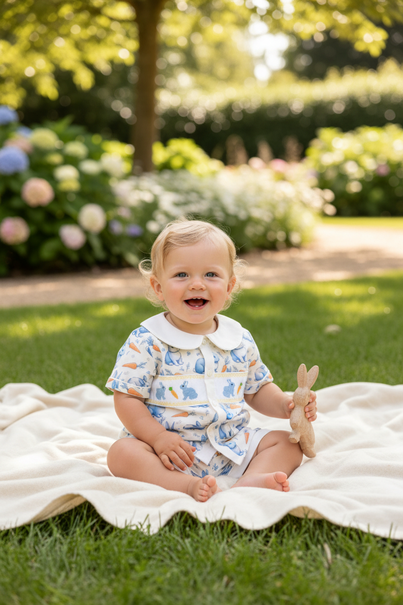 Truly unique boys bunny themed pyjama set made and designed exclusively under the Ocean Baby brand. These delightful pyjamas are cream in colour printed with a cute vintage blue bunny with carrots design. Within the smock pattern across the chest, are hand embroidered bunnies and carrots to perfectly compliment the printing design on the material of the pjs. The pjs are complete with a peter pan collar trimmed in coordinating cream, along with the sleeves and the bottom of the shorts.