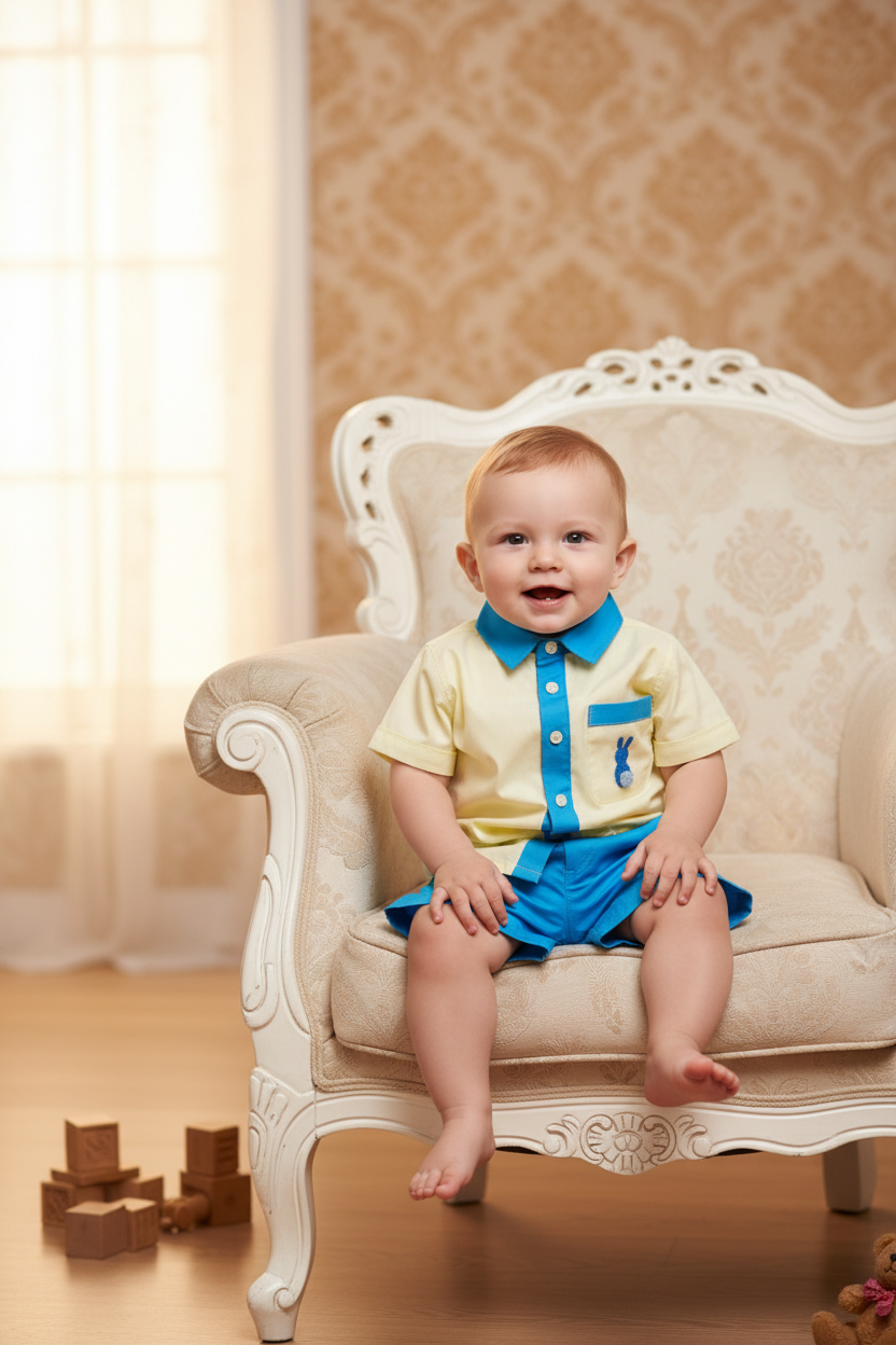 Super smart boys lemon shirt with blue collar and button down front with a hand embroidered bunny embellishment on the pocket. This set comes with coordinating blue shorts with a button front and elasticated at the back for a comfortable fit.