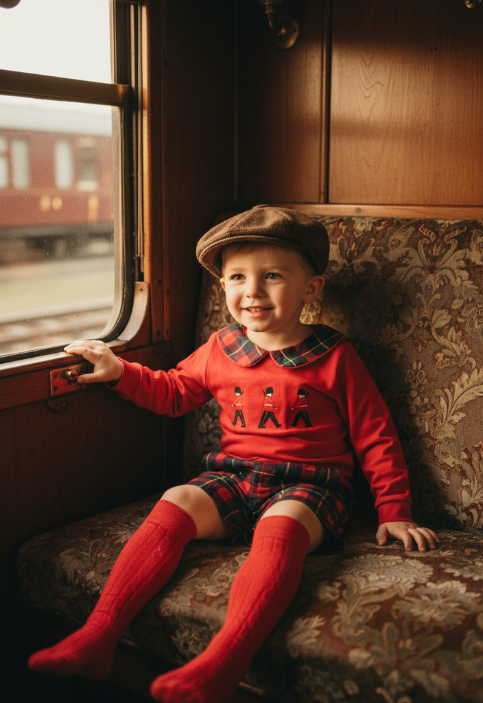 Brand new to the Ocean Baby collection our exclusive knitted range! Super stylish and perfect for the upcoming seasons. Traditional style boys knitted jumper with a hand embroidered soldiers across the chest with coordinating tartan shorts. This outfit is complete with a matching tartan peter pan collar, to complete the traditional styling on this outfit!