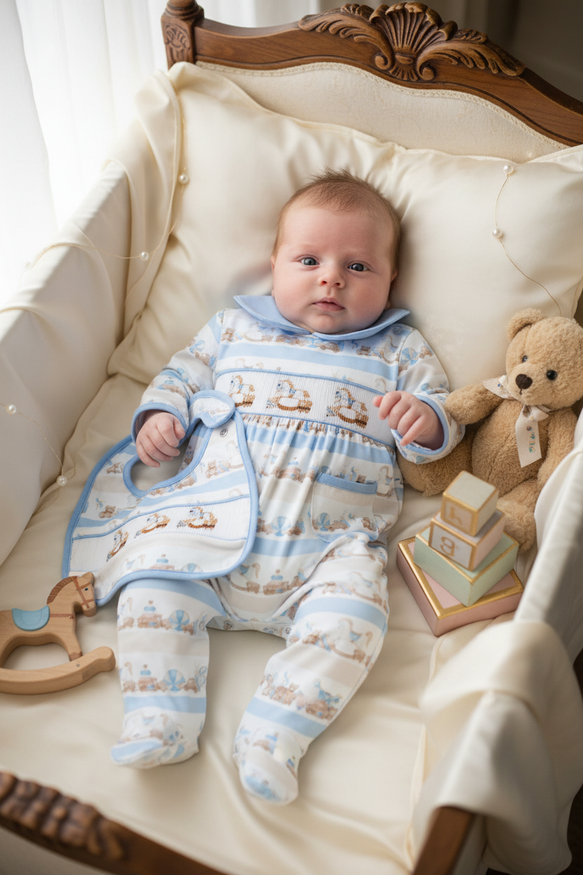 Ocean Baby Boys Carousel Smocked Sleepsuit & Bib Set (NB-18M)