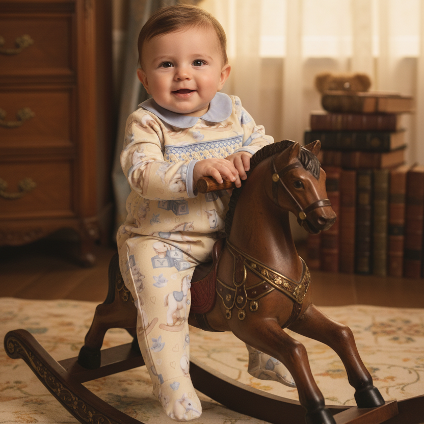 Truly unique baby boys smocked sleepsuit set made and designed exclusively under the Ocean Baby brand. This beautiful all over custom vintage bunny and rocking horse print Sleepsuit is smocked on the front with blue and cream geometric smock pattern embellishment. The suit is finished with lovely blue piping around the sleeves and on the peter pan collar.