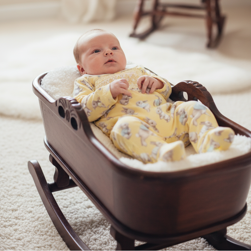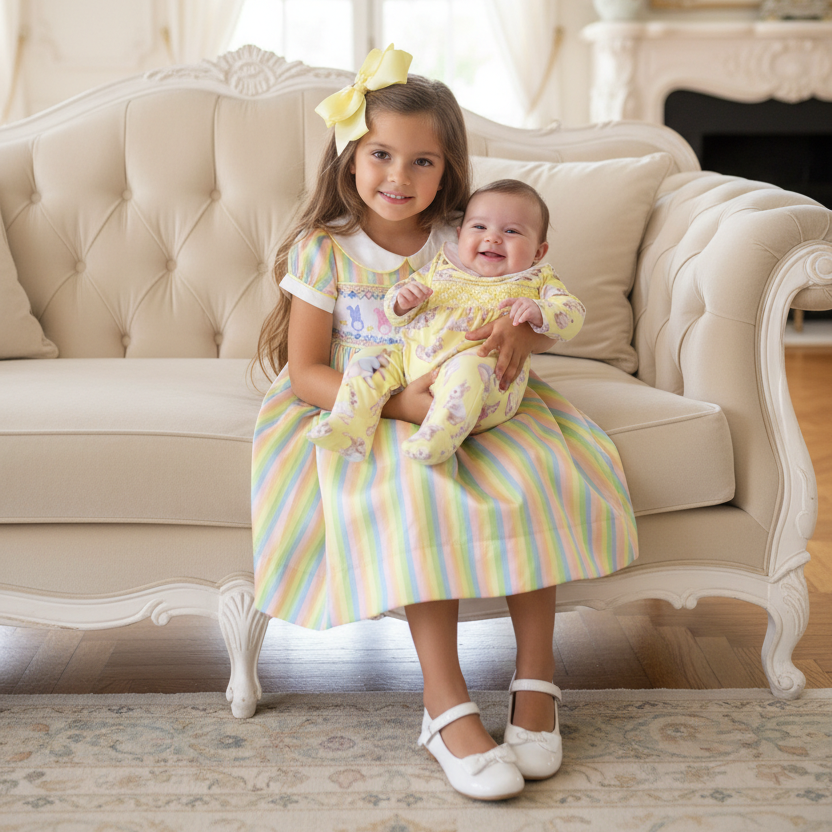 Truly unique baby boys smocked sleepsuit set made and designed exclusively under the Ocean Baby brand. This beautiful all over custom vintage bunny print Sleepsuit is hand smocked on the front in a geometric yellow smock pattern to complete the most adorable sleepsuit outfit.