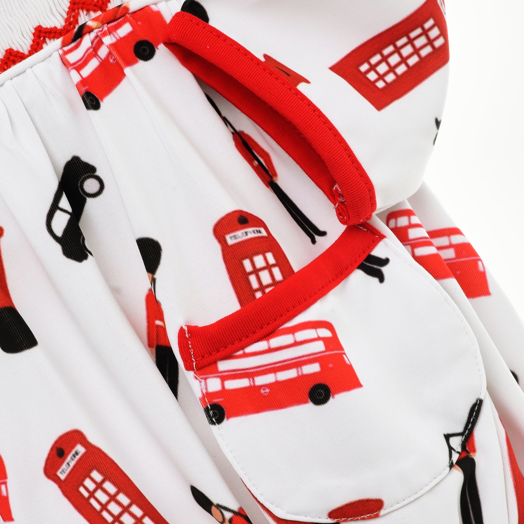 Features - Smocked front with London soldier hand embroidery and button down back, with pockets on the front. Comes with matching knee high hand embroidered socks.