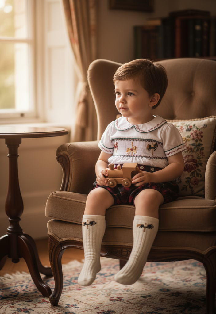 Ocean Baby Collection: Traditional style boys smocked suit. White short sleeved top with emerald edging on the cuff and collar, with gorgeous smocking and hand embroidered for beautiful embellishment. Matching autumn plaid jam pants, these are fitted with carefully placed buttons on the shirt, to attach the pants ensuring a well kept look at all times.