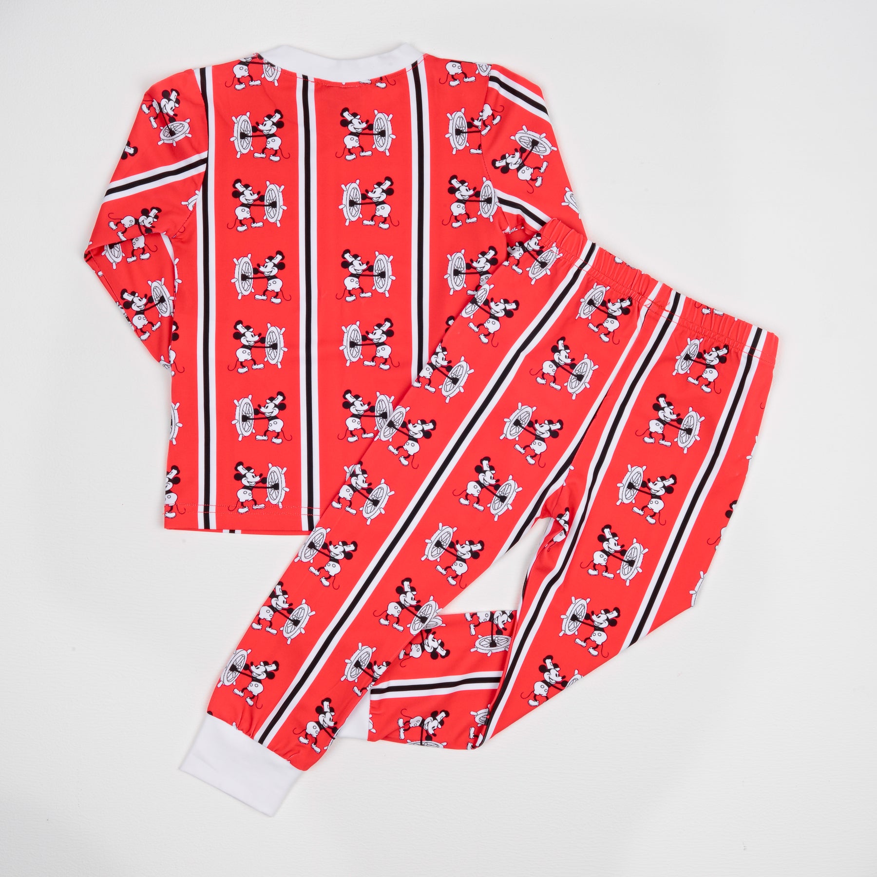 Ocean Baby Nightwear Collection: Gorgeous mickey themed boys Pyjama set. This gorgeous 2 piece set comprises of a mickey mouse themed top and coordinated trouser bottoms, with cuffed arms and legs. The pattern throughout the set is a delicate mickey print on a crisp red background.