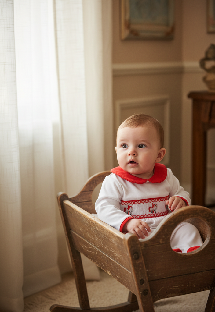 Truly unique baby smocked sleepsuit is made and designed exclusively under the Ocean Baby brand. This beautiful sleepsuit is smocked across the top of the chest in white with lovely hand embroidered rocking horses within the smock pattern. This sleepsuit is complete with a matching bib, consisting of the same hand smocked pattern.