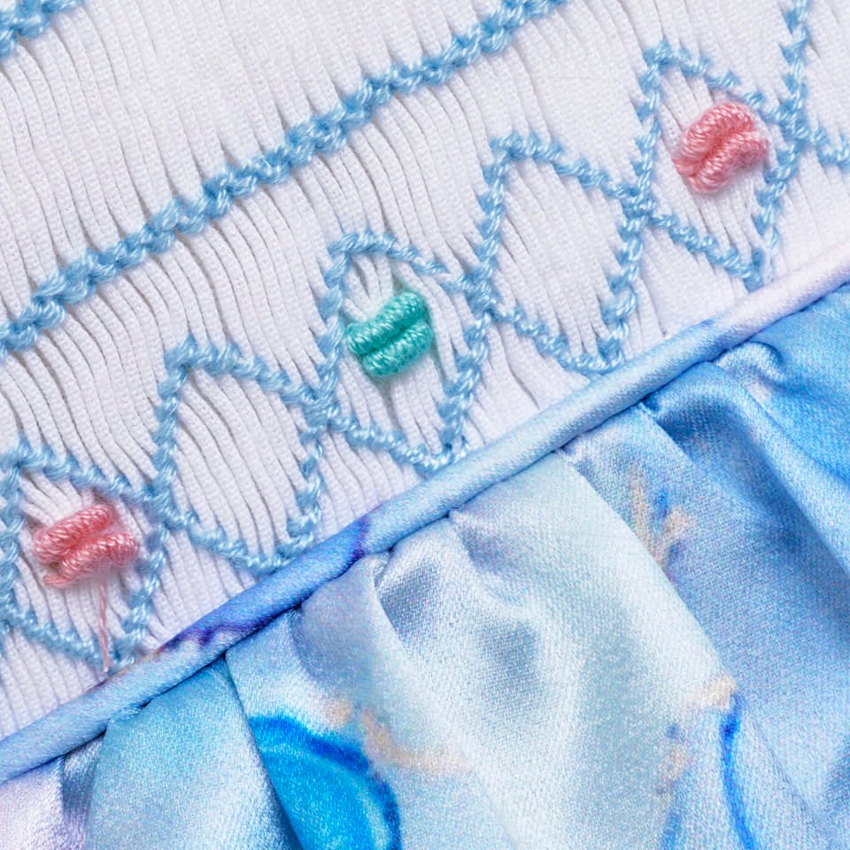 This satin dress has an all over marble effect throughout the dress, with coordinating smocked colours weaved throughout the front on the bodice. There are two turquoise bows on either side of the waist to help give this dress a little bit of extra flare!
