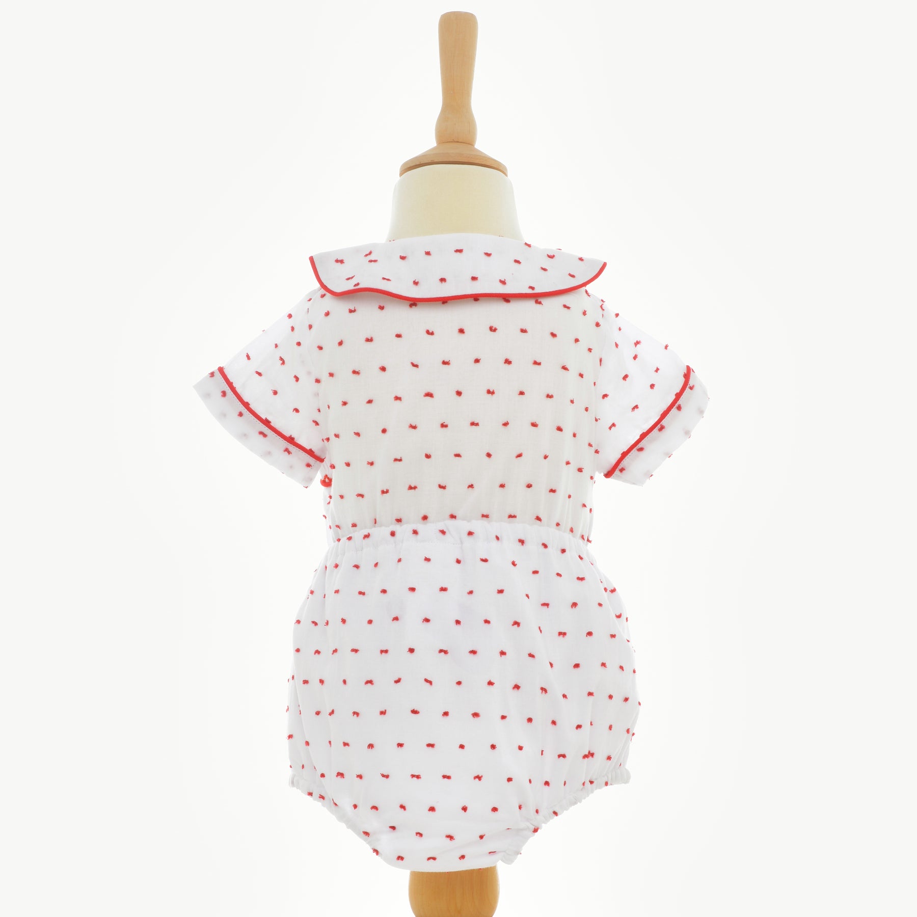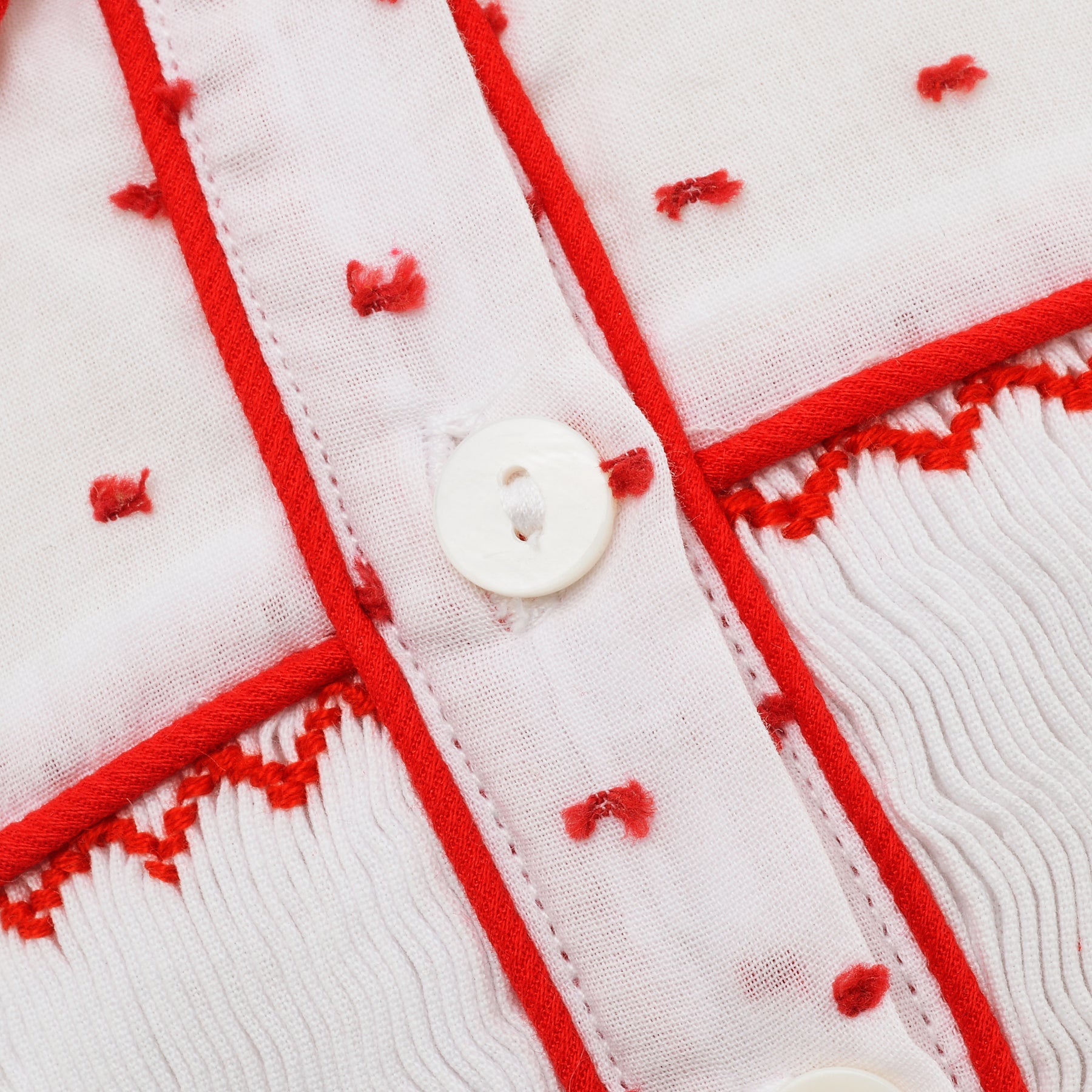 Stunning boys shirt and buster pant suit by Ocean Baby. All over white with red swiss dot top with smocking across the front of the chest, with a delicate embroidered train either side of the centre buttons. The shirt is completed with red trim around the white peter pan collar, and sleeves.