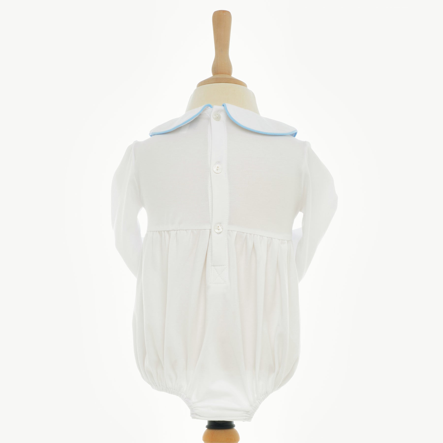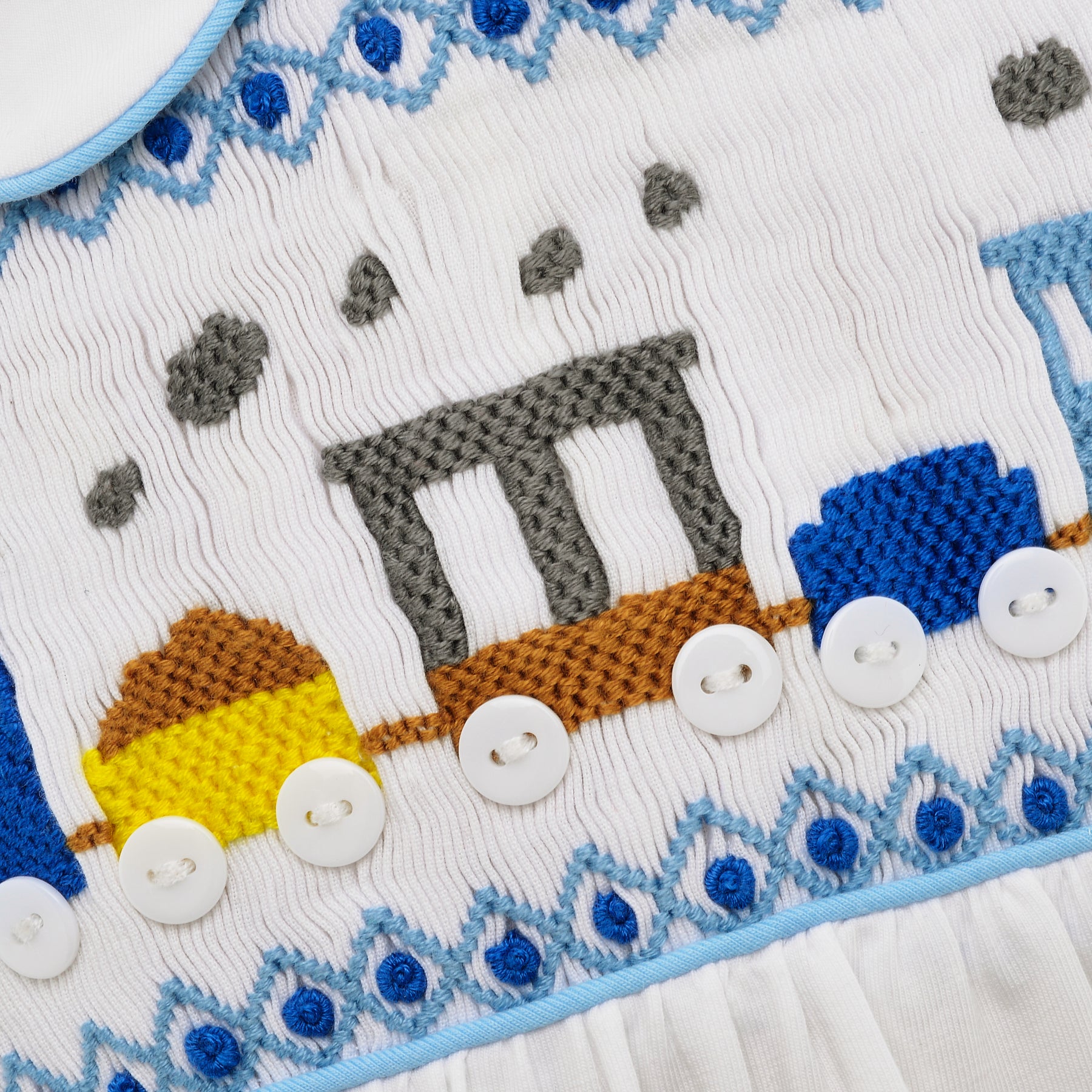 Stunning boys hand smocked bubbles by Ocean Baby. All over crisp white suit with smocking across the front of the chest, with a delicate hand embroidered train feature, both within the smocked pattern and on the decorative pockets.