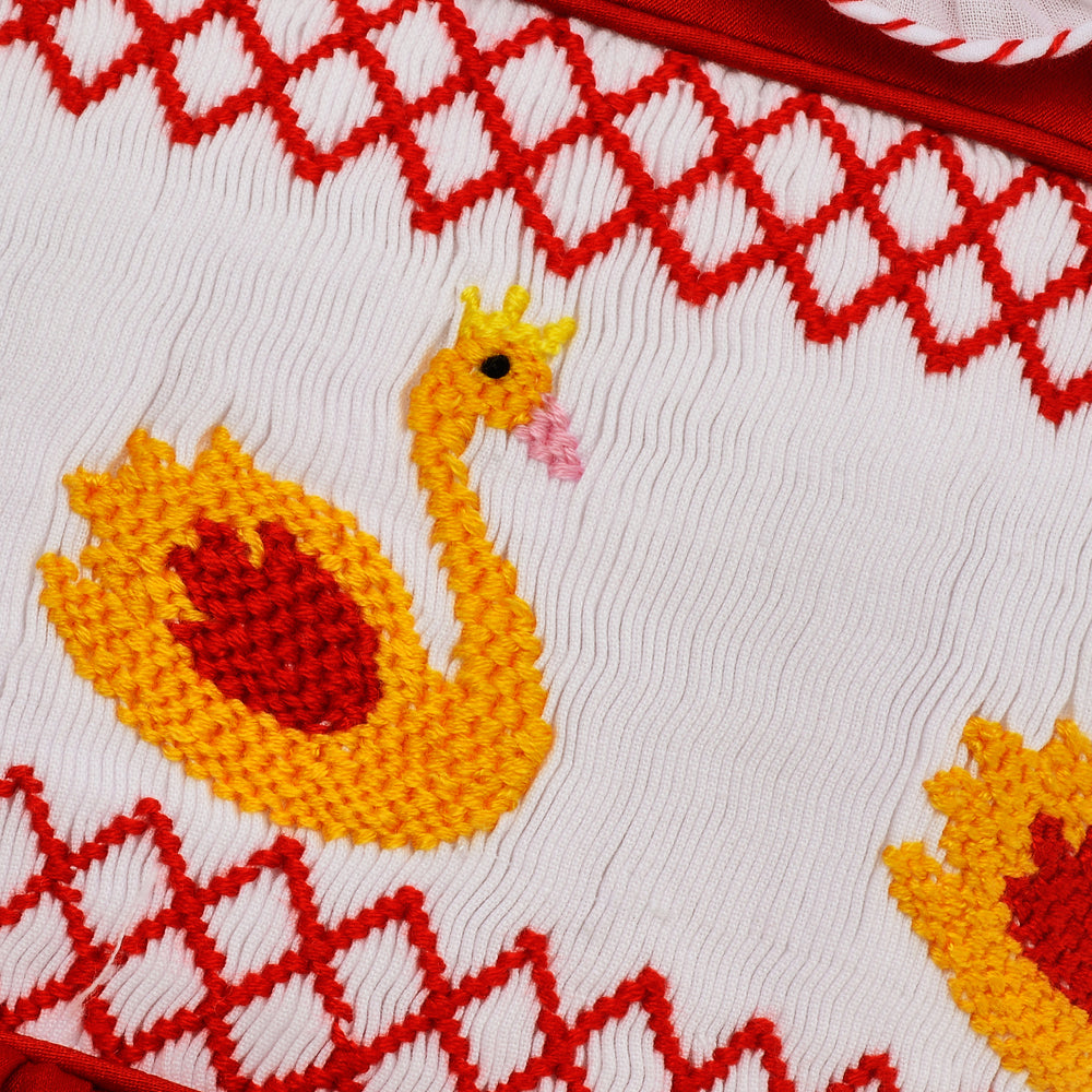 This stunning dress is criss-cross smocked on the front in red floss with gorgeous hand embroidered swan detailing in the centre. Elegant peter pan collar with two adorable hand embroidered swans on either side, and cuffed sleeves trimmed in red floss cross stitching along the frill edge. Fully lined and fitted with a 3 layer petticoat, to ensure princess feel volume.